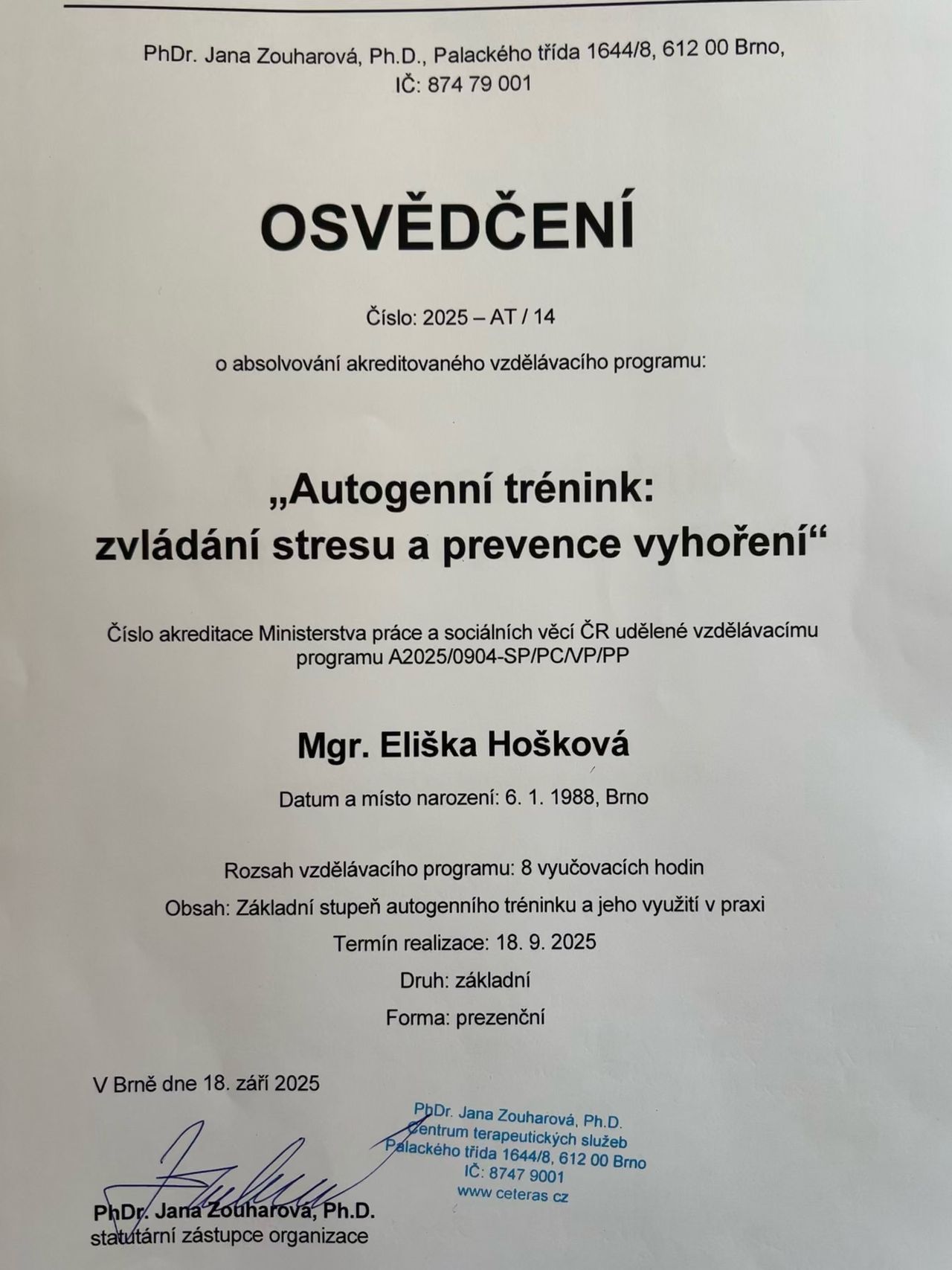 Online sezení u paní terapeutky pro mě bylo velmi příjemné a překvapivě přirozené. Rozhovor byl uvolněný, plynulý a měla jsem pocit, jako bych si povídala s kamarádkou u kávy — i přes to, že probíhal online. Moc se mi líbilo, že měpaní terapeutka nezahlcovala teoriemi ani odbornými pojmy. Povídání mělo přirozený tok, bez tlaku, a přesto dávalo směr a smysl. Díky jejímu citlivému přístupu jsem se dokázala otevřít i tématům, která pro mě nejsou jednoduchá, a odcházela jsem s pocitem úlevy a většího klidu. Už se těším na další obohacující setkání.