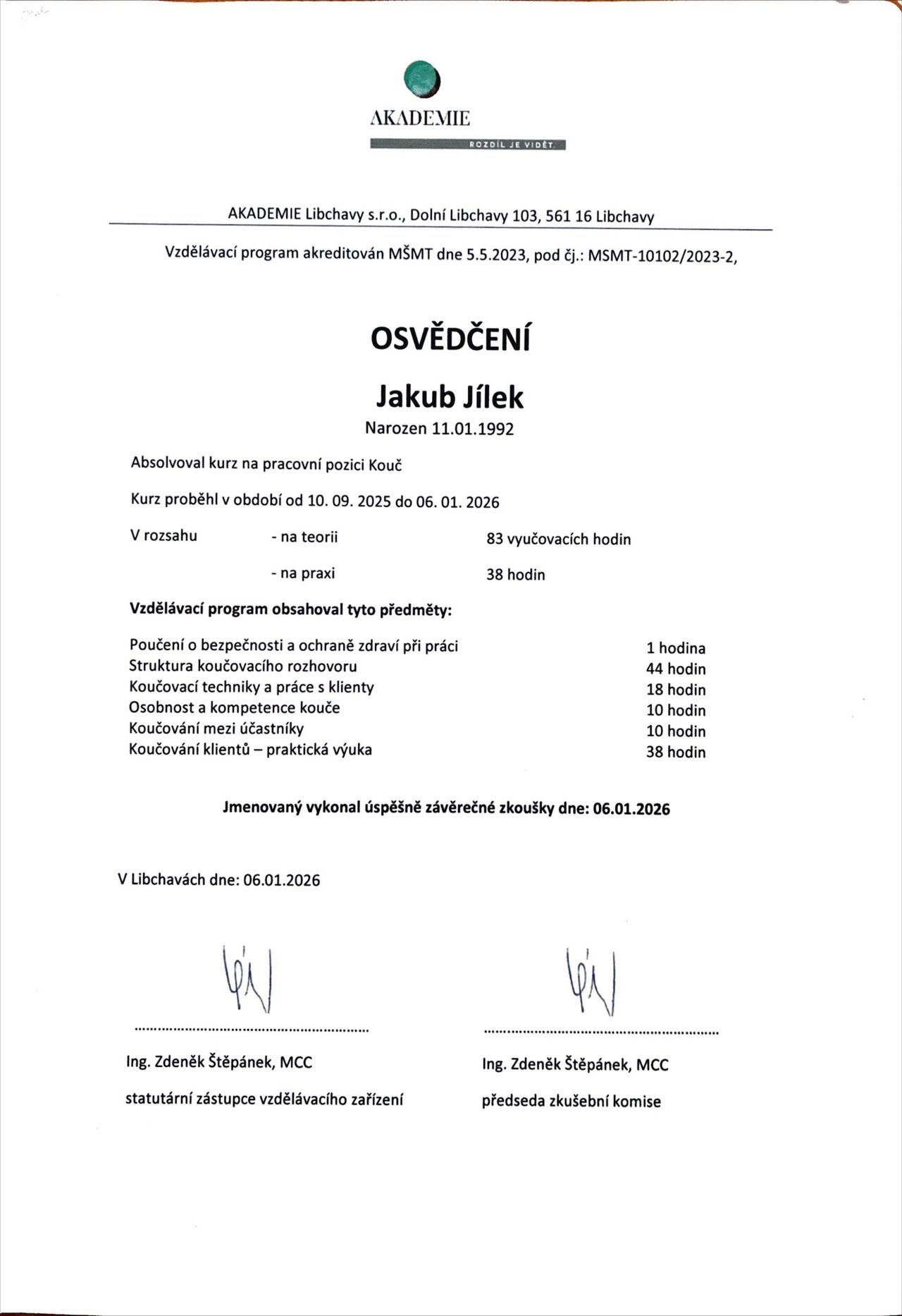 Jakub mě citlivě a bezpečně provázel procesem, během kterého jsem si začala víc věřit – v rozhodnutí, která dělám, i v cestu, kterou jsem si zvolila. Ujistil mě, že odpovědi skutečně nosím v sobě, jen někdy potřebujeme někoho, kdo nám je pomůže v sobě znovu objevit. Díky němu vnímám ve svém životě víc lehkosti, radosti a odvahy.