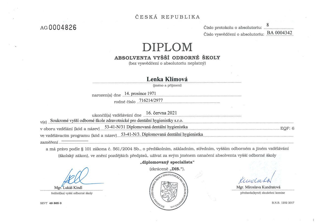 Jmenuji se Lenka Klímová a mám to štěstí, že mne moje práce dentální hygienistky těší a naplňuje. Mám radost, když vidím pozitivní výsledky své práce.