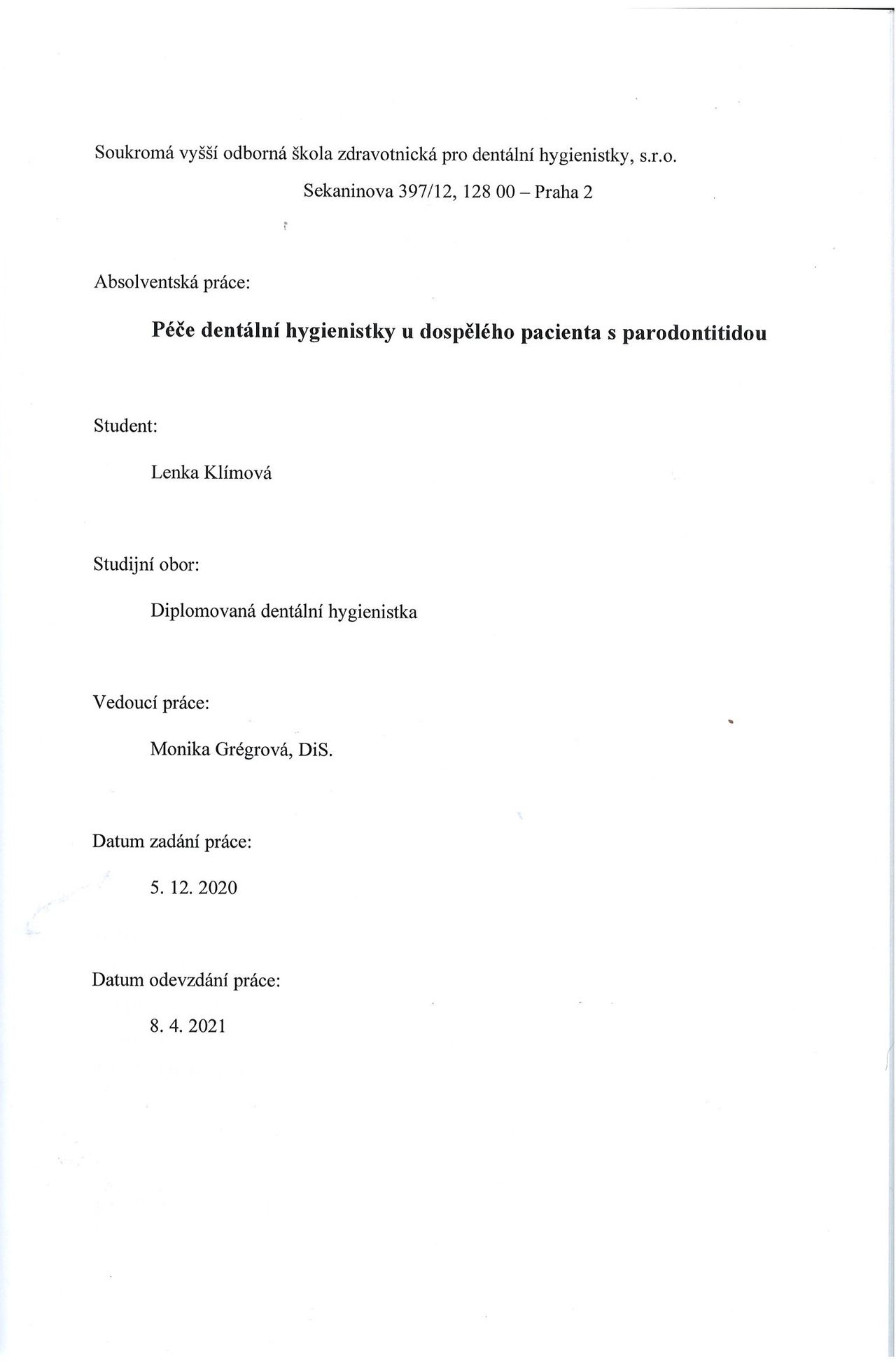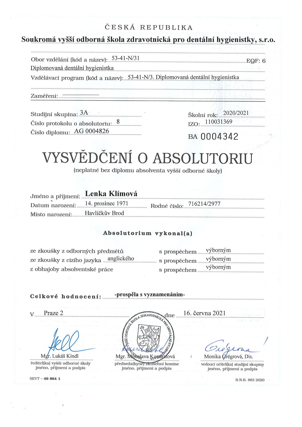 Obor dentální hygiena jsem vystudovala na SVOŠZ PRO DENTÁLNÍ HYGIENISTKY v Praze.