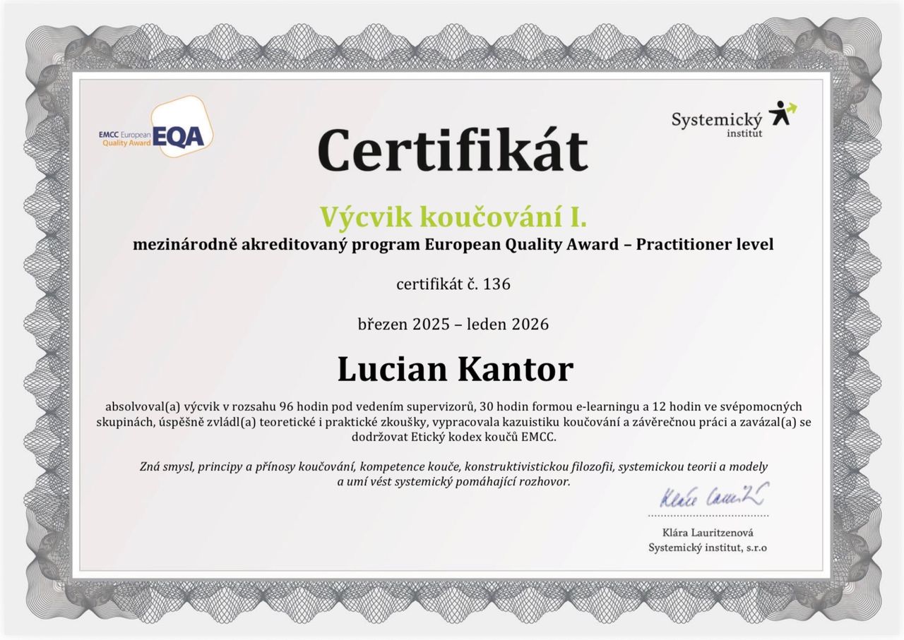 Jsem také kouč a můžeme společně nalézt Váš životní cíl, nastartovat efektivní změny ve Vašem životě a překonat bariéry na cestě za Vaším úspěchem a spokojeností.