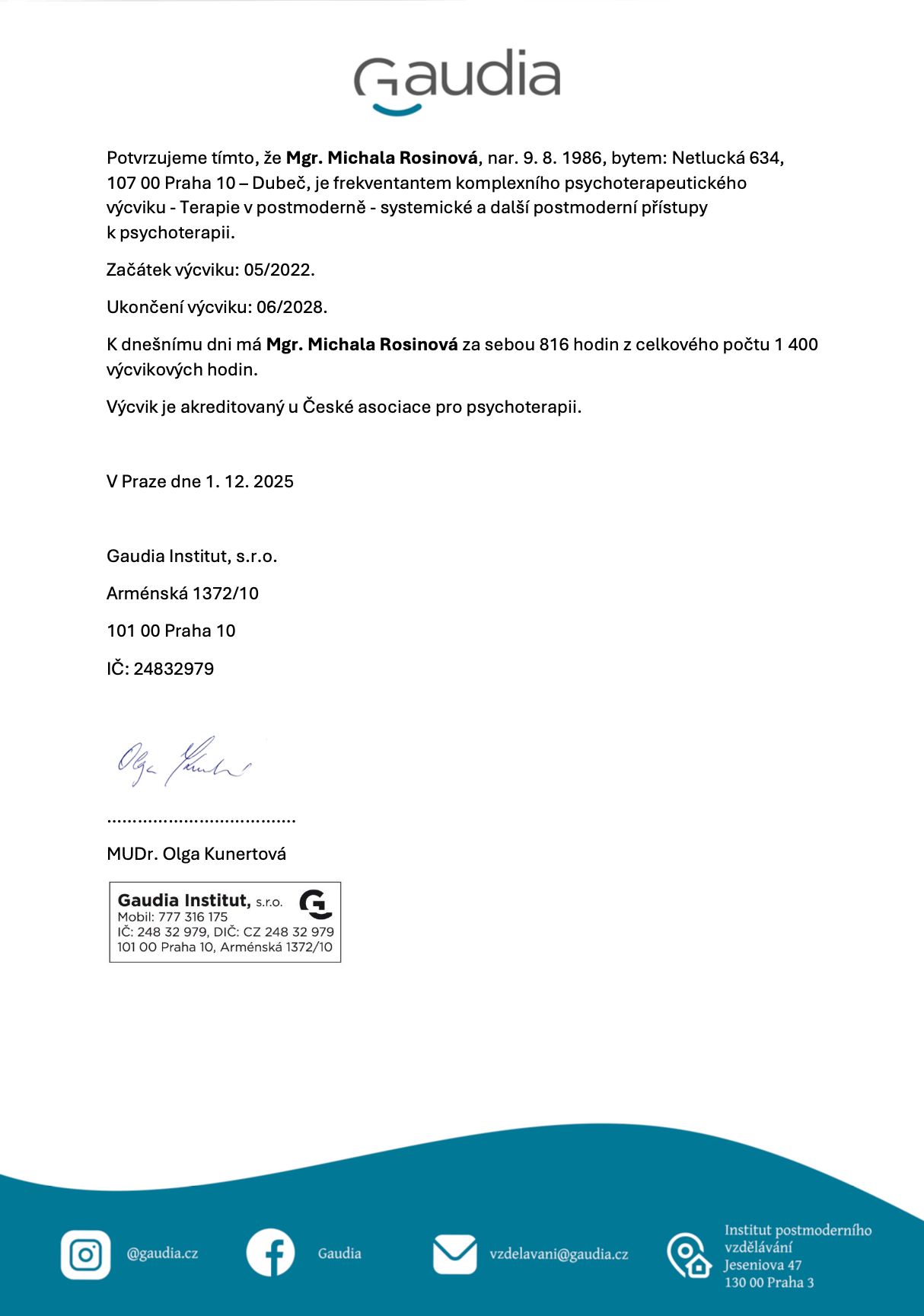 Paní Rosinová pro mě byla jedním z důležitých lidí, kteří mi pomohli při syndromu vyhoření a následné práci se zakořeněnými vzorci. Celý život se trápím s vysokou citlivostí a díky její specializaci se mi daří využívat techniky, tak abych nebyla každý den přehlcená, a daří se mi citlivost nevnímat jako slabou stránku. Moc si cením jejího laskavého přístupu a toho, že se při terapii mnohdy i zasmějeme.