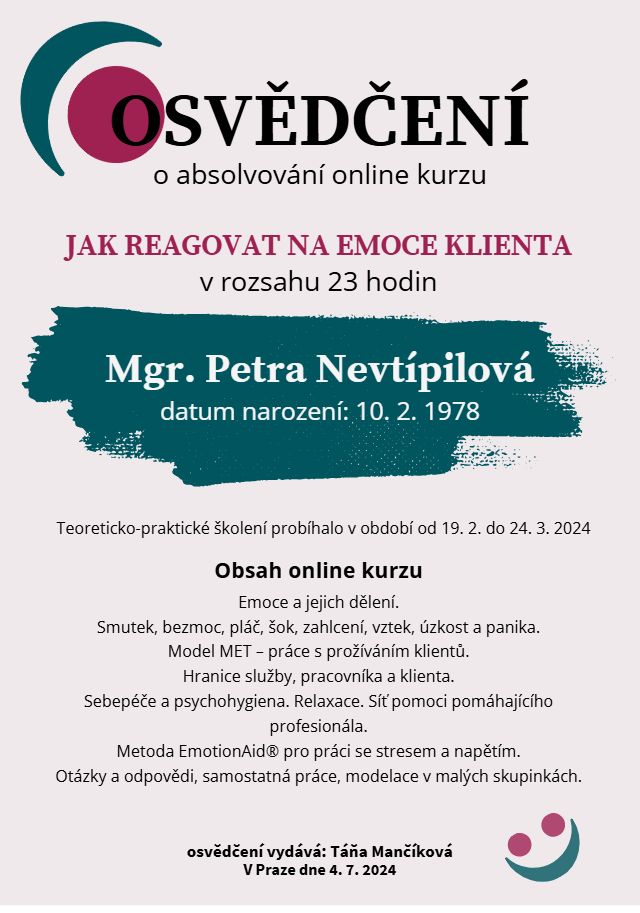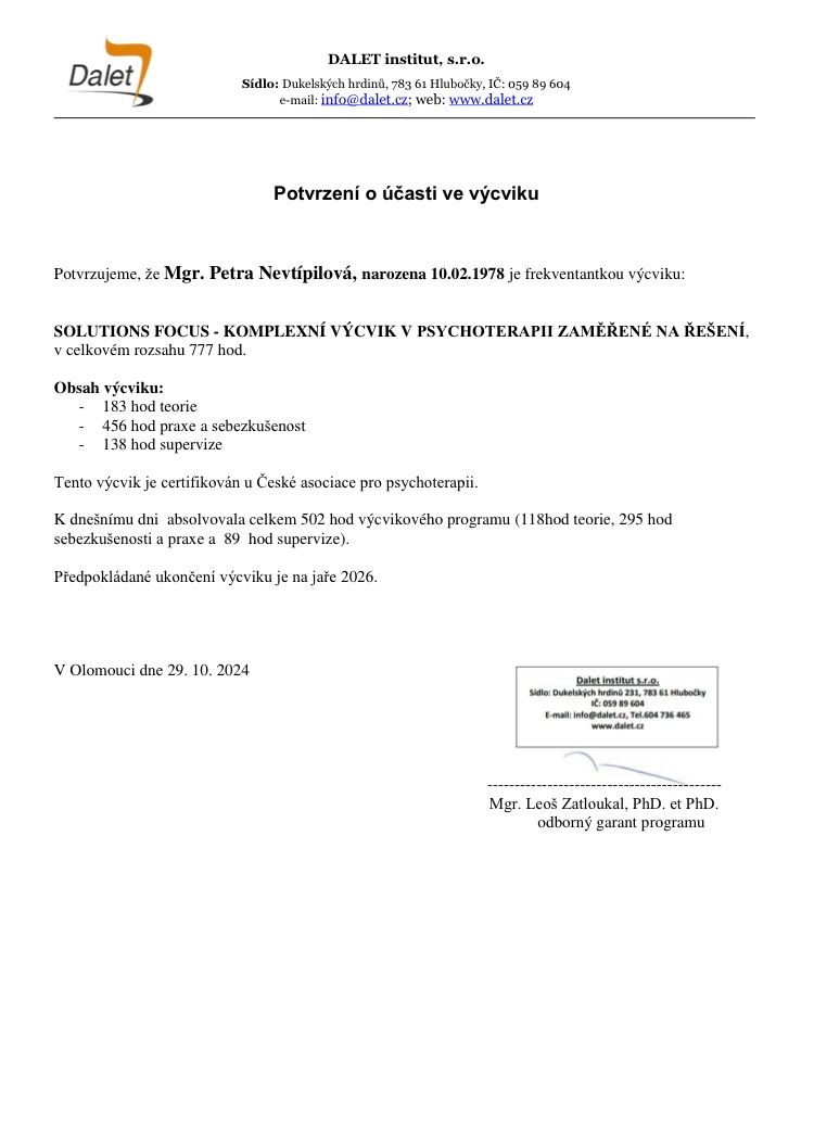 Spolupráci s paní Nevtípilovou hodnotím velice pozitivně. Prvotně stanovený cíl byl naplněn, a to díky setkáním plných podnětných otázek, zajímavých cvičení, vhodných technik a asertivní komunikace. Vážím si profesionality, znalostí a snaze dopracovat se co nejefektivněji požadovaných výsledků. Nikdy jsem neměla pocit jakéhokoli nátlaku, paní Nevtípilová mi jen vždy nastavovala zrcadlo a poukazovala na možnosti, což je přesně to, co jsem potřebovala. Ještě jednou mnohokrát děkuji a spolupráci s paní terapeutkou rozhodně doporučuji.