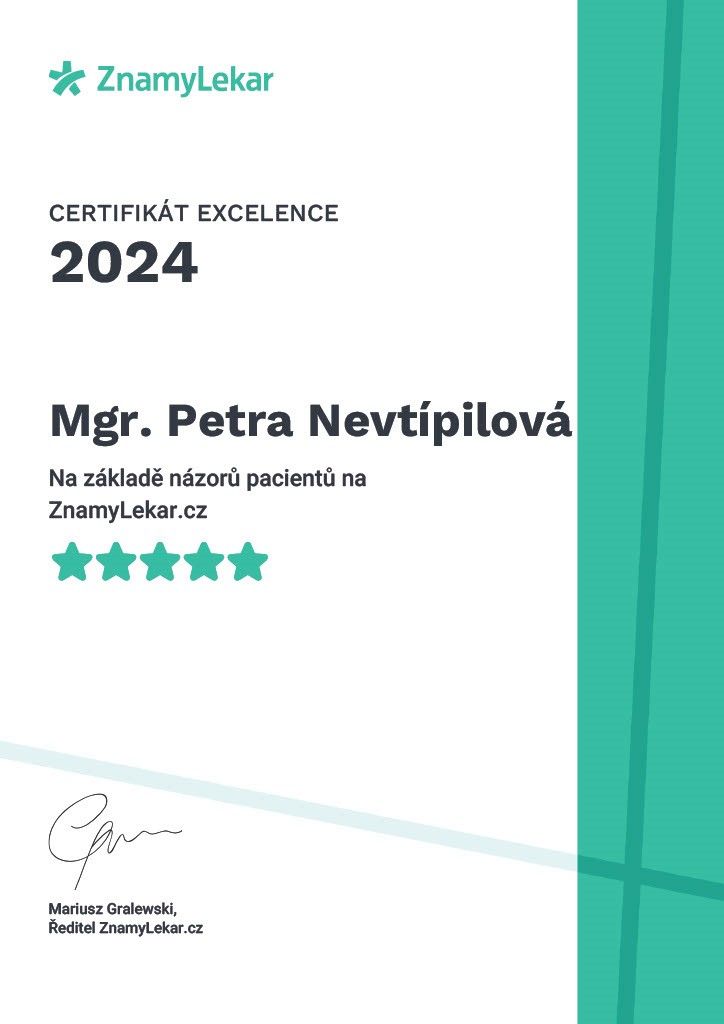 Paní Nevtípilová je velice profesionální a empatická. Její přístup my vyhovoval. Hledala jsem pomoc, ale nechtěla jsem se hrabat v minulosti, potřebovala jsem se naučit s danými situacemi umět pracovat. Vyhovovalo my, že se terapie zaměřují na řešení. Netvrdím, že to vždy bylo lehké, nedostáváte univerzální rady jak na to, vše je jen na Vás. Co se ale týká paní Petry byla pro mě tím nejlepším průvodcem to celé zvládnout. Dokázala jsem se svým problémům postavit a pracovat s nimi. Jsem ráda, že jsem se tenkrát rozhodla právě pro paní Nevtípilovou a vřele ji doporučuji všem, co terapii zvažují.