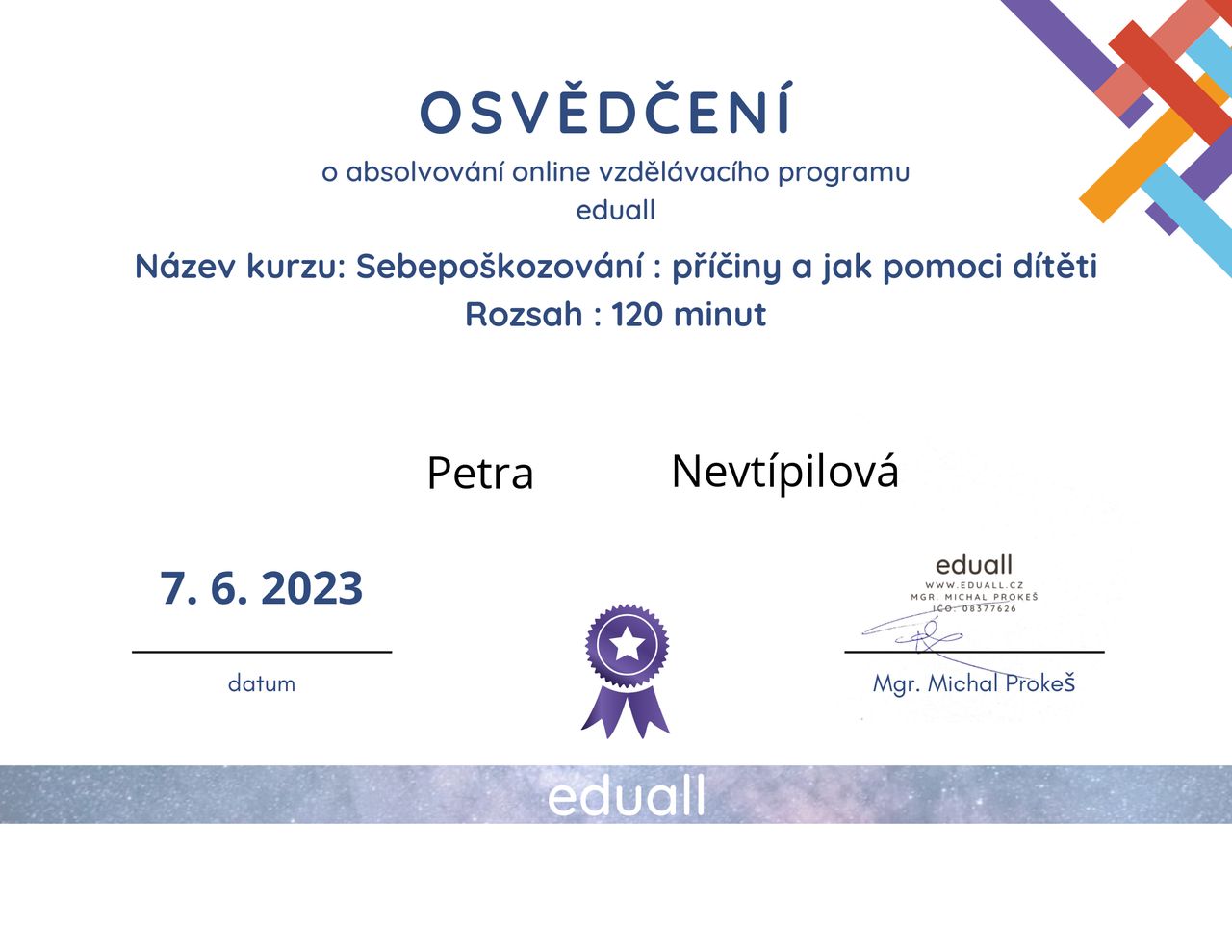 Dobrý den, nedávno jsem v životě zažila jedno zklamání sama ze sebe – jeden z mých životních karambolů. Nejprve jsem se snažila vše zpracovat sama, ale cítila jsem, že potřebuji mluvit s někým, kdo mě nezná a nebude soudit. Obrátila jsem se na Mgr. Nevtípilovou a měla jsem štěstí, že měla prostor k setkání. Konzultace probíhaly velmi příjemně a zdravě – kladla mi otázky, které by mě samotnou nenapadly, a pomohla mi utřídit si myšlenky. Odcházela jsem vždy s větší lehkostí a pochopením sebe sama. Konflikty k životu patří a někdy je bolestivé se s nimi setkat, ale rozhovor s terapeutem je v takových chvílích velmi léčivý. Jak píše Exupéry v Malém princi: „Musím přece snést dvě nebo tři housenky, když chci poznat motýly.“ Děkuji. Mgr. Nevtípilovou vřele doporučuji.